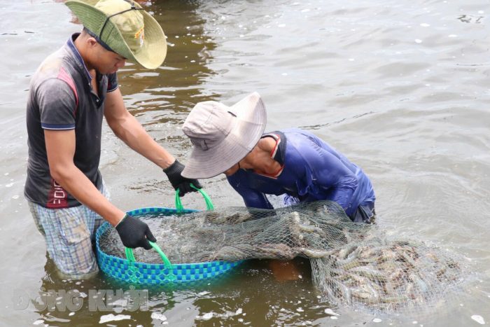 Thu hoạch tôm nuôi công nghệ cao ở huyện Thạch Phú. ảnh: Phương Thảo
